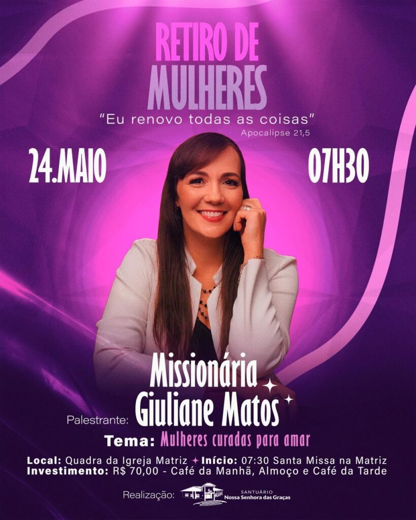 Para nos conduzir nessa jornada de cura e amor, teremos a presença iluminada da Missionária Giuliane Matos, palestrante de fé vibrante e testemunho de vida transformada pela graça de Deus.